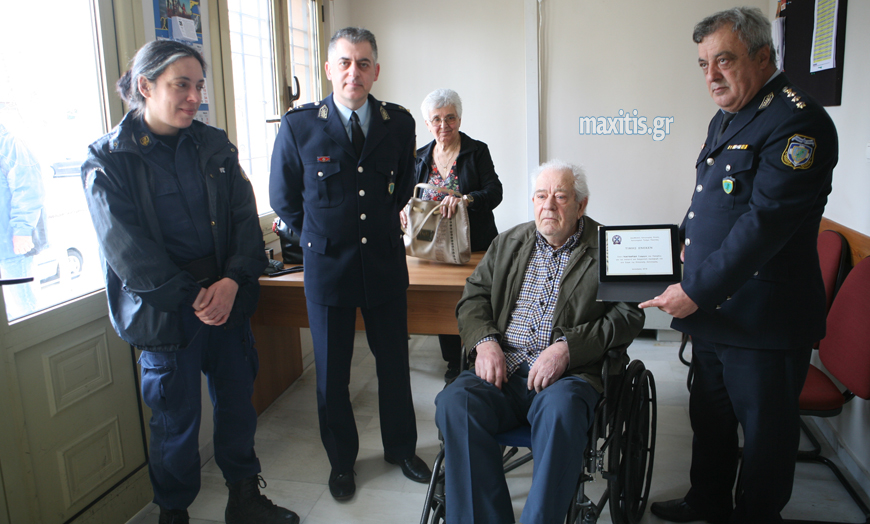 Συγκινημένοι ο Υποδιεθυντής Δημήτριος Χαραλαμπίδης, της Διεύθυνσης Αστυνομίας Κιλκίς, μαζί με το Διοικητή του ΑΤ Παιονίας Αντώνιο Μπουζαλά, σε μια λιτή τελετή (28/03) στις εγκαταστάσεις του Αστυνομικού Τμήματος Παιονίας, με εδρα το Πολύκαστρο, παρέδωσαν τιμητική διάκριση στον απόστρατο Γιώργο Γκαγκαρίδη και τον ευχαρίστησαν για την εξαίρετη πράξη του και την προσφορά του.